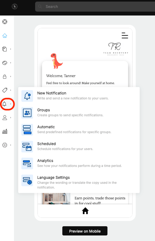 1. Access your app's control panel and select the 'Notification Groups' option from the sidebar menu.